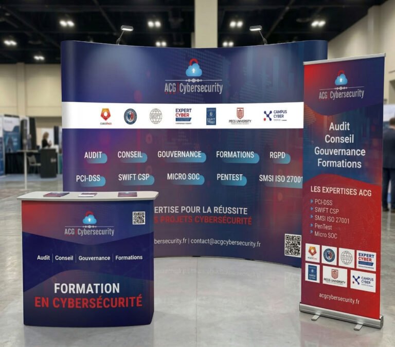 Création graphique d’un kakémono (roll-up) professionnel destiné à promouvoir des formations en cybersécurité. Le design met en valeur l’accréditation officielle en tant que partenaire ISACA et présente de manière claire les différentes certifications mondialement reconnues proposées (CISA, CRISC, CISM, CGEIT,…