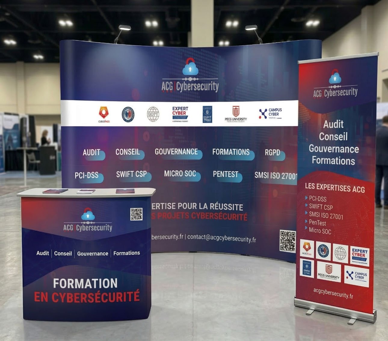 Découvrez notre réalisation d’aménagement visuel pour le stand d’exposition d’ACG Cybersecurity, expert en sécurité des systèmes d’information. Pour maximiser l’impact de la marque lors de salons professionnels, nous avons conçu une identité visuelle forte, déclinée sur trois supports essentiels :