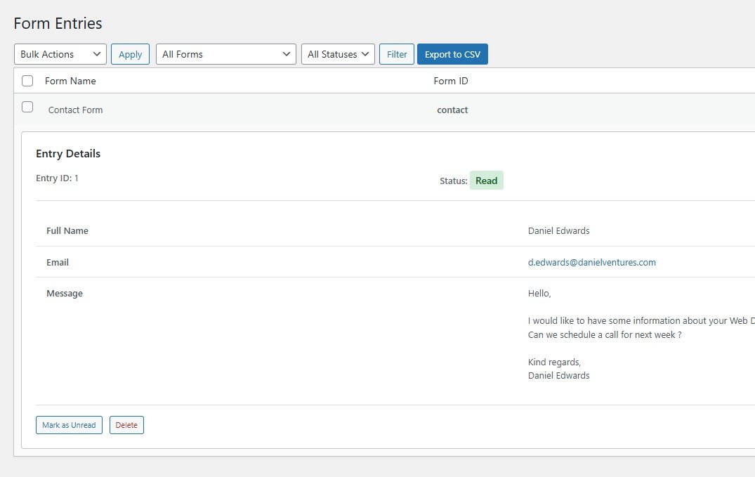 Tüm gönderilerin net bir kaydını tutun. Yönetim arayüzü mesajları sıralamanıza (okundu/okunmadı), bir akordeon sistemi aracılığıyla tek bir tıklamayla ayrıntıları görüntülemenize ve forma göre filtrelemenize olanak tanır. Veriye mi ihtiyacınız var? CSV dışa aktarımı eksiksiz ve temiz bir şekilde biçimlendirilmiştir.